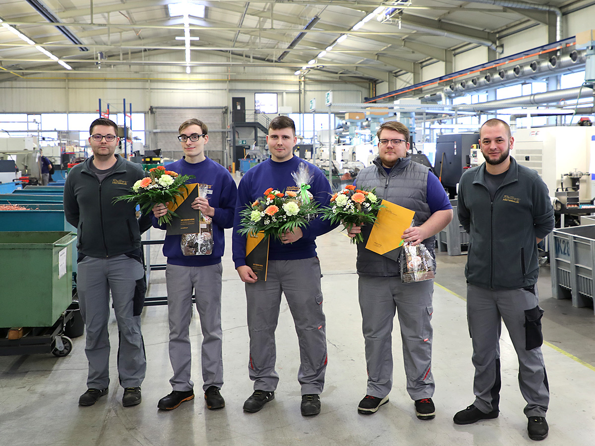 Kjellberg Finsterwalde heißt seine frisch ausgelernten Jungfacharbeiter mit der Übernahme im Berufsleben willkommen. Die sechs Kjellberger Justin Schumann, Erik Lehmann und Eric Heyde (Zerspanungsmechaniker), Cedric Klaue und Lucas Winzer (Industriemechaniker) sowie Danny Mittelstädt (Elektroniker für Betriebstechnik) haben in den vergangenen Wochen ihre Prüfungen erfolgreich bestanden und sich für eine Weiterbeschäftigung bei Kjellberg entschieden.