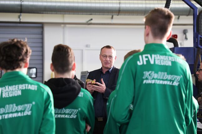 Als „Bronze“-Sponsor des neugegründeten Jugendförderverein der Sängerstadtregion unterstützt Kjellberg Finsterwalde junge Fußballer aus Elbe-Elster mit nagelneuen Trainingsanzügen eigens für die Teams der C- und B-Junioren. Dabei ist es das oberste Ziel des Vereins und nicht zuletzt auch seitens Kjellberg, den Nachwuchs dieses Vereinszusammenschlusses aus der Region gebündelt zu fördern und damit eine Zukunftschance für nachhaltige Sportkultur, auch in kleineren Gemeinden, zu geben. Das soziale Engagement endet jedoch nicht auf dem Sportplatz, weshalb Spieler, Trainer und Vereinsvorstand ins Unternehmen kamen und sich live ein Bild von Kjellberg als Sponsor machten. Der Geschäftsführer der Kjellberg Finsterwalde Plasma und Maschinen GmbH Volker Krink sowie Kjellberg Ausbildungskoordinatorin Maya Vlahova freuten sich über das große Interesse und erklärten nicht nur Wissenswertes zu Kjellberg und deren Technologien, sondern gaben auch Tipps zu Ausbildungsmöglichkeiten im Unternehmen.