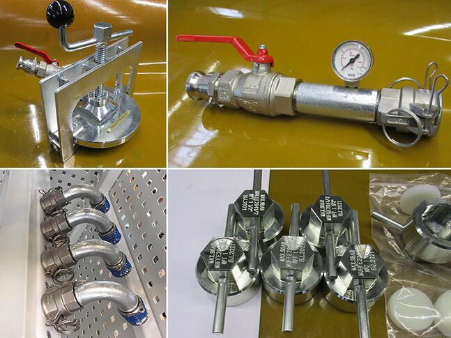 Diese Vorrichtungen werden in Prüffeldern genutzt, um Flansche und Rohrstopfen gezielt abzudichten, Drücke zu messen, oder Flüssigkeiten gezielt abzulassen.