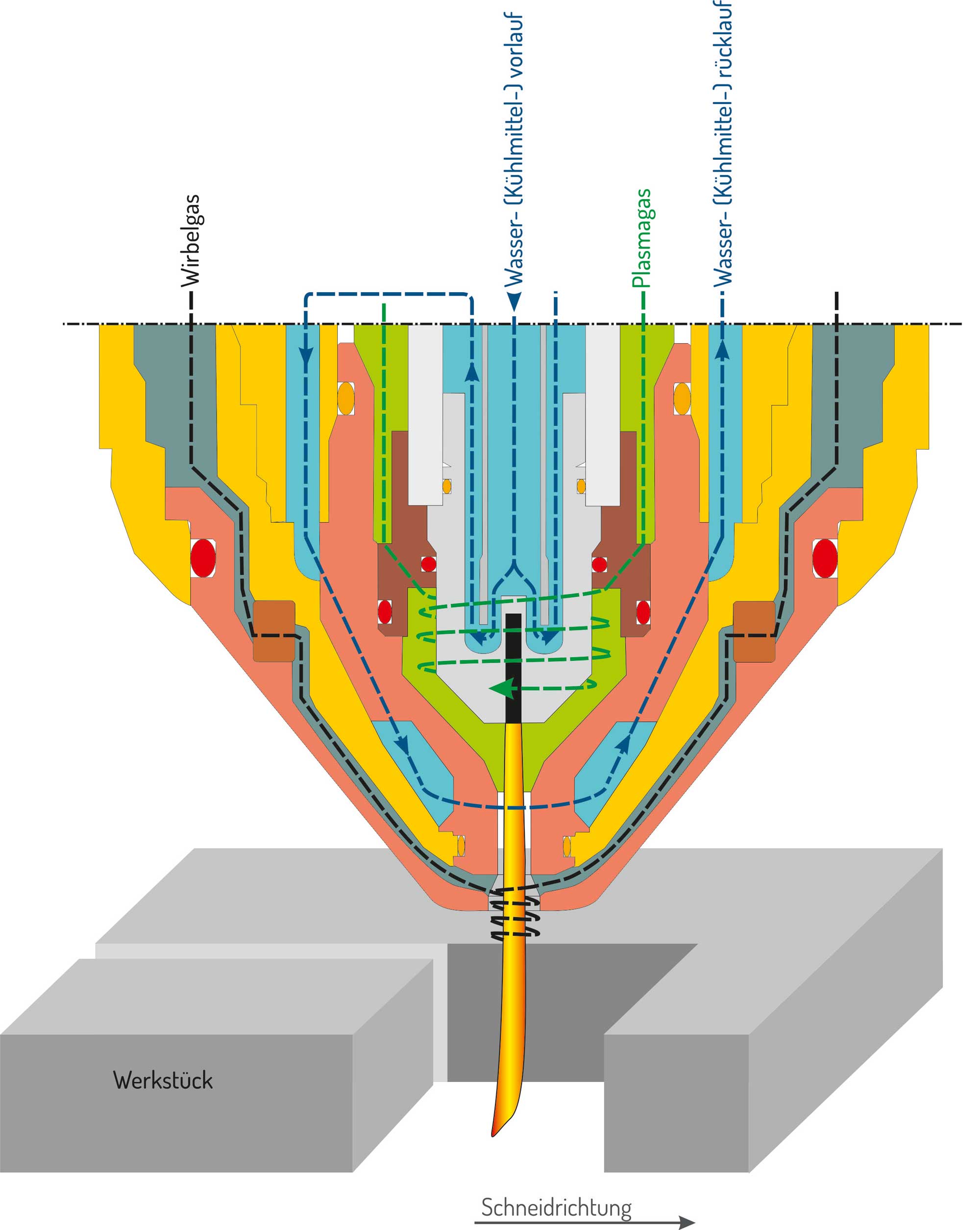 Beim Plasmaschneiden wird zwischen einer Elektrode und dem Werkstück ein Lichtbogen erzeugt, welcher lokal durch mindestens eine Düse eingeschnürt und mit einem Gas beaufschlagt wird. Der Plasmalichtbogen hat eine extrem hohe kinetische Energie. Dadurch wird der Werkstoff lokal aufgeschmolzen und die Schmelze aus der Schnittfuge getrieben. Das Plasmaschneiden gehört zu den thermischen Schmelzschneidverfahren.